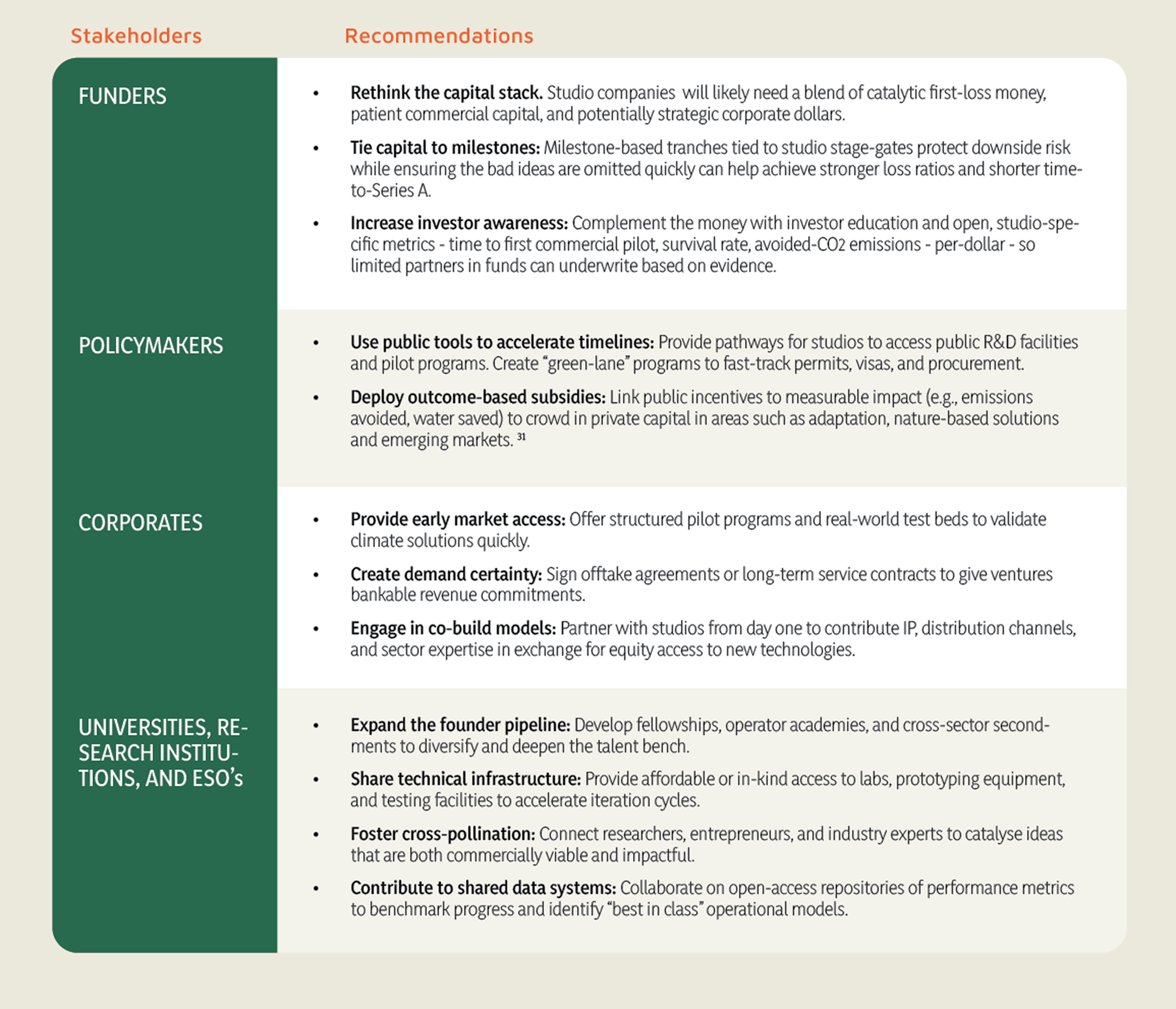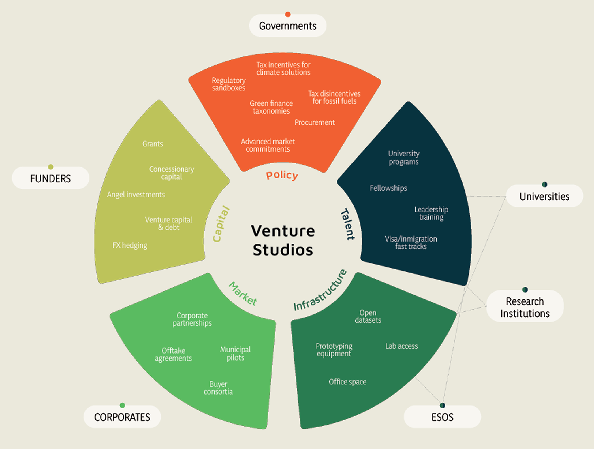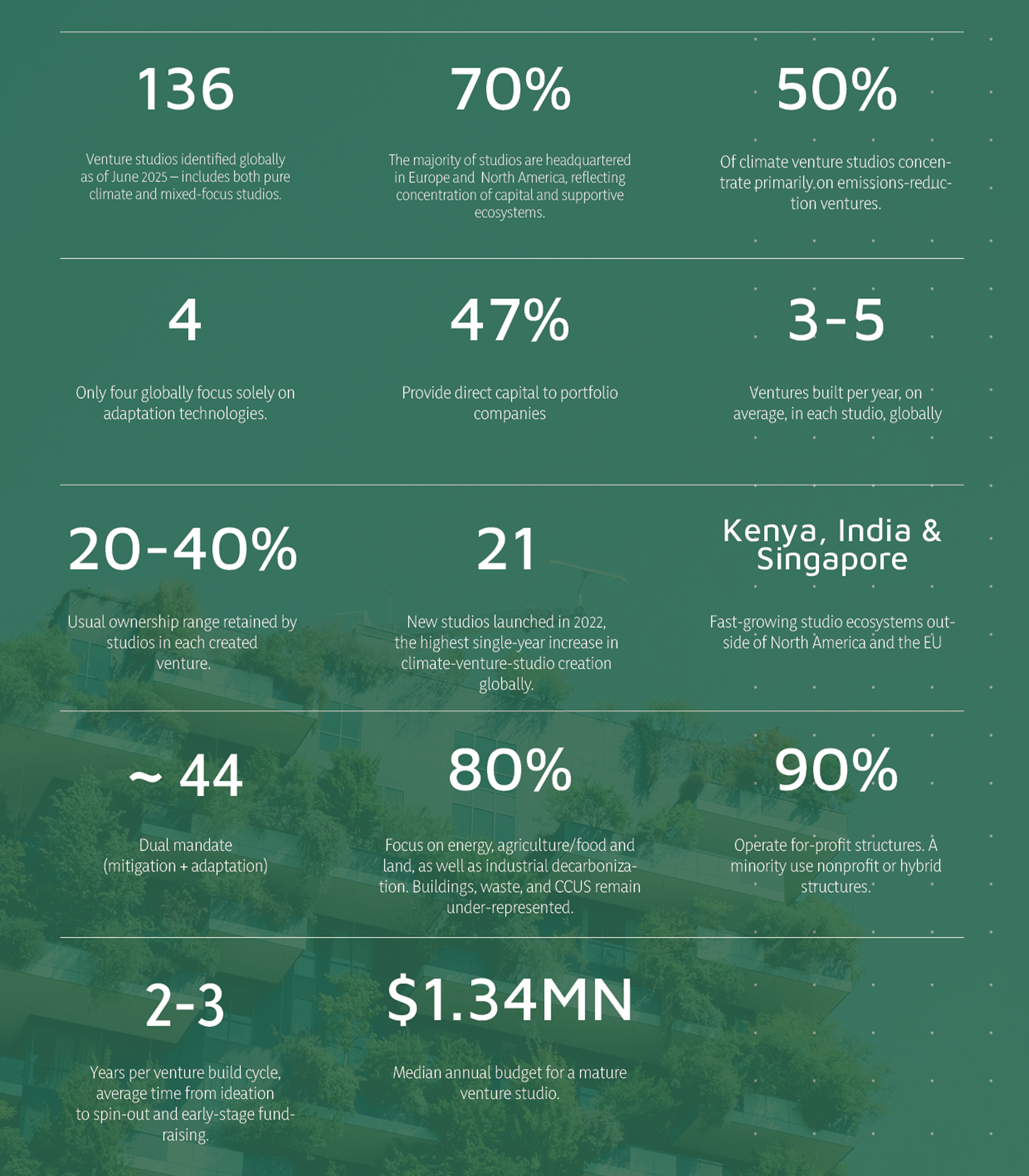 This report provides a critical overview of climate ventures studio activity to date, mapping out the different models that studios are using to create new companies globally, as well as the challenges they are facing in addition to the new opportunities to investment, partnership and impact that they enable. To undertake this study we interviewed 46 climate innovation experts from across venture studios, corporations, funds, accelerators and universities to understand the different processes, challenges and opportunities. Additionally, we mapped the current global landscape of climate-focused venture studios and built a database of 136 organizations that use at least some element of a studio approach.